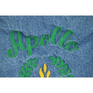 It has chainstitch embroidery on the front that says "Mike" and on the back is a large design that says "Apollo Guard"
