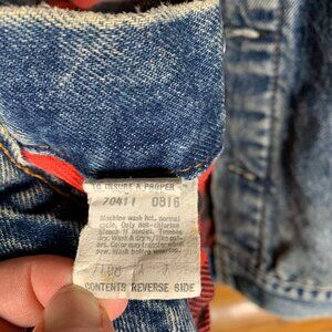 This is one of my absolute FAVORITE vintage pieces ever. Great vintage size 46 Levi's trucker style jean jacket with band patches and vintage pins. Red Black buffalo check flannel lined. Has some rips and stain, absolutely beautiful patina. I would say this would fit a men's M and a women's L/XL. Would be so cool worn oversized though. Back has a Famous motorcycle patch. All over the jacket there are various band patches (Van, Halen, Pink Floyd, The Grateful Dead, Def Leppard) and then a cluster of vintage pins on the chest (Hanz Krypt, motorhead, Oakland A's, Def Leppard and an I like Ike and Dick). Definitely a classic piece that I hope will be treasured.