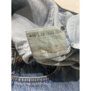 These Vintage Levi’s 501 Button Fly Denim Jeans in size 33/31 were made in the USA and feature a classic mid-rise fit with a straight leg style. The denim fabric is 100% cotton, showcasing a solid blue color with distressed accents for a unique look. The 5-pocket design and button closure add to the traditional appeal of these Levi's jeans, making them a versatile wardrobe staple suitable for all seasons. Perfect for those who appreciate quality craftsmanship and timeless style.