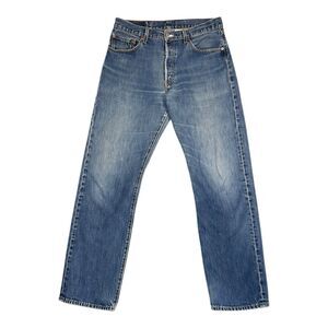 Vintage Levis 501 Original Fit jeans in good condition with natural fading and slight distressing near the rear seat area (see photos). Features button fly, straight leg, and classic mid-blue wash. Made from durable 100% cotton denim.