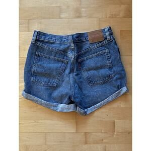 The product is a pair of vintage Levi’s 501s medium wash high waisted button fly cuffed denim shorts in size 28. These solid blue shorts are made from 100% cotton denim with a classic fit and flat front design. The high rise waist and cuffed hem add a stylish touch, perfect for casual occasions like traveling, party cocktails, or beach outings. The shorts also feature a vintage appeal, fitting in with themes from the 70s, 80s, and 90s, making them a versatile and trendy addition to any woman's wardrobe.