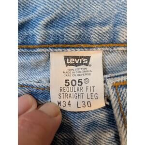 This product is a pair of Vintage Levi's 505 Jeans in a men's size 34x30, featuring a distressed grunge, Y2K workwear style with a straight leg fit.