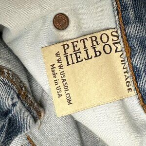 Classic vintage shorts by Petros. Distressed. Red tag on back. Vintage chain stitching on pockets. Diamond pattern stitch at bottom of pocket stitching indicating vintage. Worn leather Levi Strauss back patch.
