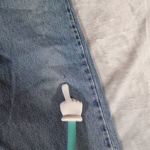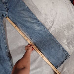 Has spots pictured here on the front and back of the leg. Measures smaller than what is tagged. Please check photos for details and measurements!