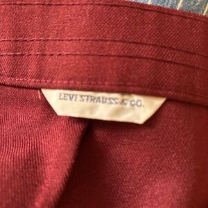 Step back into retro style with these vintage Levi’s 513 trousers from the late 1970s–early 1980s. Made from a rich ox blood burgundy polyester, these pants capture the disco-era vibe with a straight cut. They feature a small interior Levi Strauss & Co. label and the original stubby care tag typical of Levi’s vintage slacks.