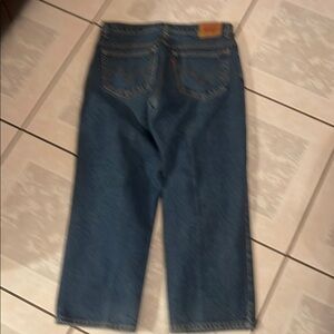 These relaxed jeans feature a classic medium blue denim wash with a slightly worn-in look. The cropped length and straight leg cut provide a comfortable and stylish fit for casual outings. #11