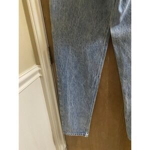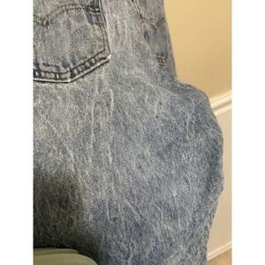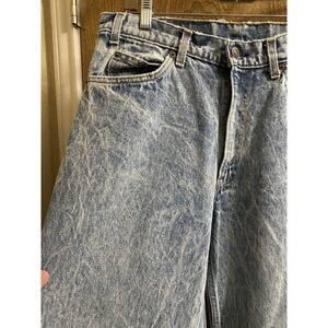 This is a vintage pair of Levi's 550 jeans for men, size 33x36, with an orange tab and acid wash denim. The jeans have a relaxed fit and tapered style, with a high rise and 5-pocket design. They feature distressed details, comfort, and easy care. The fabric is made of cotton and machine washable. The jeans are perfect for any season, and their solid blue color and vintage look make them ideal for retro and classic styles, including grunge, bohemian, and cowboy.