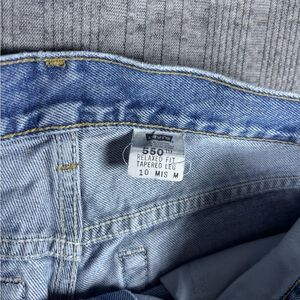 Vintage Levi’s 550 Jeans in size 10 with a relaxed fit and tapered style. The denim fabric wash is light, and the design features a high rise waist with a zip and button closure. These jeans are comfortable and versatile, suitable for all seasons. With a classic blue color and a 30 inch inseam, they embody a trendy retro aesthetic from the Y2K era, making them a stylish addition to any woman's wardrobe. In good used condition with some minor flaws/fading.