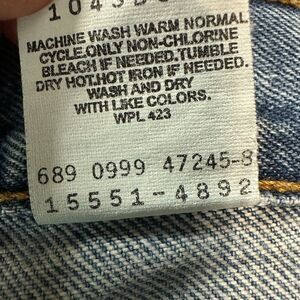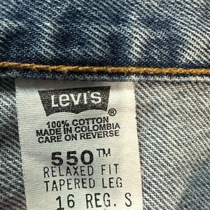 The product is a pair of vintage Levi's 550 Jeans for women in size 16 with a relaxed fit, made from 100% cotton denim in a light wash. The jeans feature a solid blue color, button and zipper accents, and a logo detail. They have tapered style, perfect for a 90's-themed look. With easy care and comfort in mind, these Levi's jeans also have pockets for added convenience. Made in Colombia, these classic denim pants are a stylish addition to any wardrobe.
