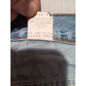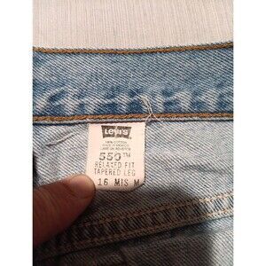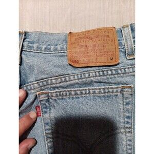 This product is a pair of vintage Levi's 550 jeans for women in size 16 with a relaxed fit and tapered leg. The denim fabric is blue with a high rise waist and features a 5-pocket design. These jeans are made of cotton and are machine washable. They come in a classic solid color with a medium wash, and are part of the Levi's 500 Series. Ideal for all seasons, these retro-inspired jeans have a Y2K American theme and are a timeless addition to any wardrobe.