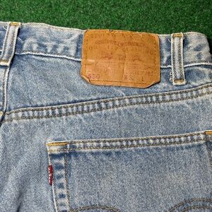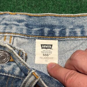 The product is a pair of Vintage Levi's 550 Relaxed Baggy Jorts in a light wash, made of denim fabric with a relaxed fit. These shorts have a waist size of 32 inches and an inseam of 12 inches, making them ideal for casual, workwear, or travel occasions. The blue color and classic American theme make them a versatile piece for any wardrobe, perfect for those looking to add a touch of USA, grunge, or 90s style to their outfit.