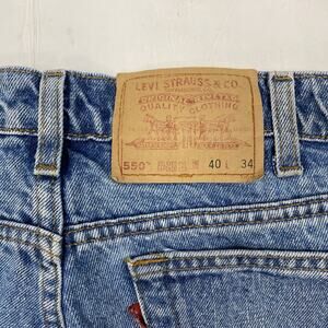 Vintage Levi’s 550 relaxed fit tapered leg jeans. Classic light wash denim with natural fading and worn-in character. Tagged size 40x34 but measure closer to 37x32 (see measurements below). Made in Puerto Rico, 100% cotton denim, red tab, 5-pocket design.