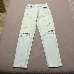 Stylish Levi's jeans with a distressed design. Light blue color. Perfect for casual wear. These jeans have been custom distressed faded and worn in.