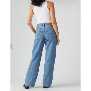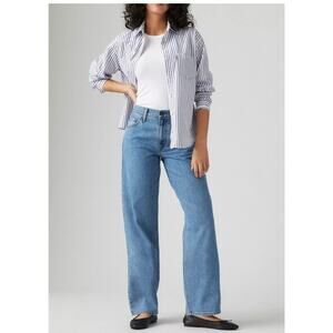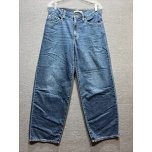 The product is a pair of Levi's Baggy Dad Mid Waist Jeans in size 28 for women. These blue denim jeans feature a zip closure, mid-rise fit, and a relaxed style. The design includes a 5-pocket layout, logo accents, and are made of a blend of polyester and cotton for durability. The jeans are machine washable and suitable for all seasons, making them a versatile addition to any wardrobe, complementing various fashion trends from the 90s to hip hop culture.