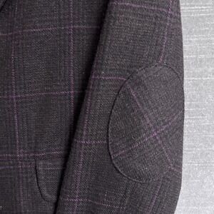 Dark brown plaid with subtle purple lines and elbow patches for classic style