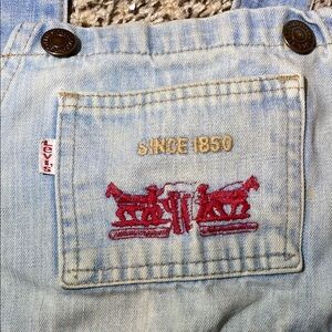 Vintage. Experience timeless style with Levi's blue denim overalls, perfect for any casual occasion. Crafted with durable fabric, these overalls offer both comfort and a classic look. Ideal for those who appreciate iconic fashion with a modern twist. Distressed, pre-loved, please refer to pictures, please note one shoulder strap buckle is missing.