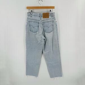 Authentic vintage Levi’s Orange Tab jeans in a classic light wash. Features a high-rise fit, straight leg silhouette, and raw frayed hems for a perfectly lived-in look. Sturdy 100% cotton denim with true 80s/90s character and iconic orange tab branding. Women’s size 8 Long.