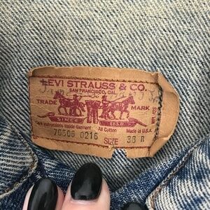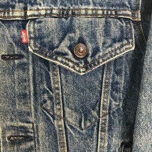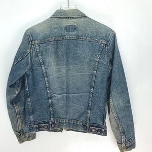 Classic, vintage Levi's red tab denim jacket with three sewn on patches. A gold pin on the collar is an Eagle Scout pin. This jacket has been laundered and dried with no damage to the patches. These can be easily removed, if desired. This is a great jacket. Excellent pre-owned condition. Size 38R.