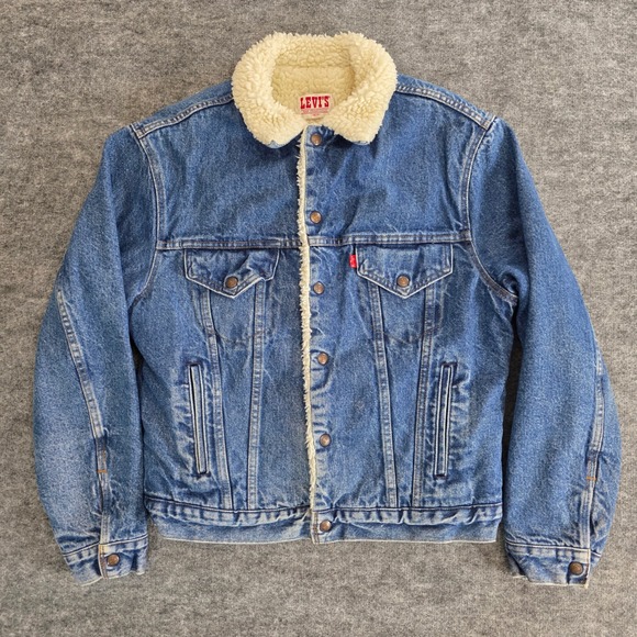 Keywords: vintage levis, sherpa lined jacket, denim trucker jacket, made in usa denim, 90s style jacket, rugged outerwear denim, classic levis jacket, winter denim jacket, workwear style jacket, medium wash denim jacket, levis 40R jacket, vintage workwear jacket