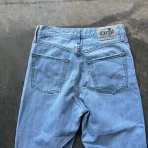 The product is a pair of vintage Levi's Silver Tab jeans for women in size 27x31. These blue denim jeans feature a relaxed fit with a high rise, zip closure, and 5-pocket design. Made of cotton denim with a light wash, these '94 Baggy style jeans are machine washable and suitable for all seasons. The Levi's Silver Tab product line adds a unique touch to these classic denim pants, making them a stylish and versatile addition to any wardrobe.