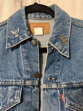 One-of-a-kind, fully customized vintage Levi’s denim trucker jacket featuring a large embroidered Harley-Davidson eagle patch on the back and two metal pins on the collar (eagle + Harley). This is a rare statement piece that blends classic Levi’s style with biker culture — perfect for collectors, riders, or anyone who loves bold vintage.