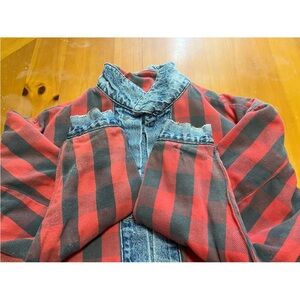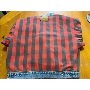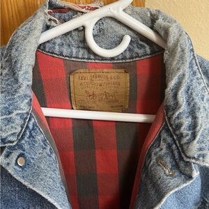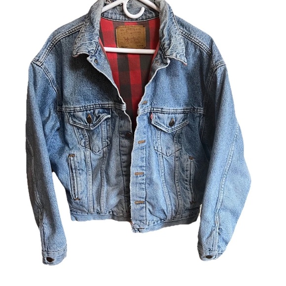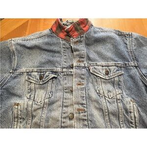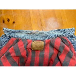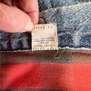 Authentic late‑1980s Levi’s 70417 style, featuring an indigo finish and classic red/black buffalo plaid flannel lining. Medium size. Made in USA.