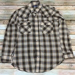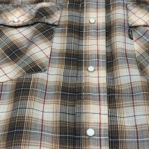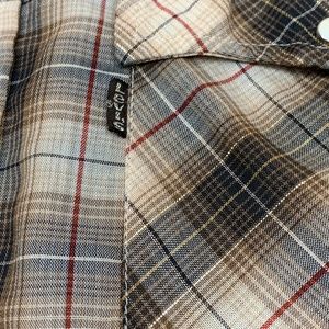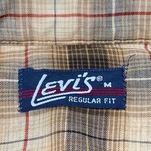 Very good condition, pre-owned vintage 1980's Levi's Regular Fit Western Style shirt. Brown and cream plaid pattern with a brown Levi's tag on the pocket. Pearl snap buttons and a very lightweight cotton blend. There is a very small stain on the back - see all photos. Men's size Medium.