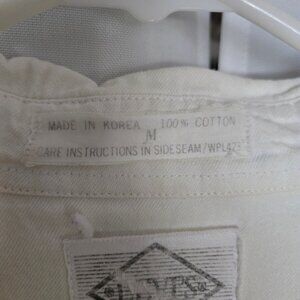 Vintage Levi's white button down shirt with two chest snap down pockets. White pearlized snaps Red tag. 100% cotton. Small stain(?) on front (see pic 6). Otherwise, great used condition. No rips or tears. No missing snaps. From a smoke free and pet free home.