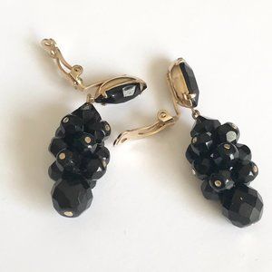 Gold Black Faceted Glass Beaded Dangle Clip On Earrings.