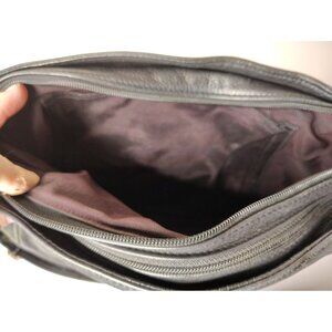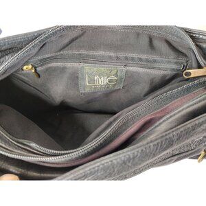 This vintage Libaire black leather handbag features a distressed look and an adjustable strap for versatile styling. Perfect for casual occasions, it's both fashionable and functional. It measures 13" in length, 10" in height with a strap measuring 36". It does have some wear on the bottom and sides and some markings on the inside as it is in vintage condition; please see all photographs as they are part of the description. Shipped with USPS Ground Mail.