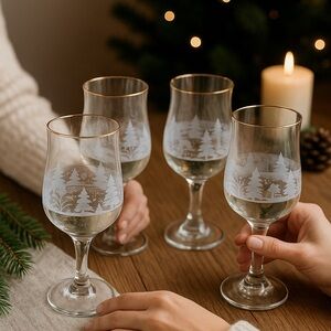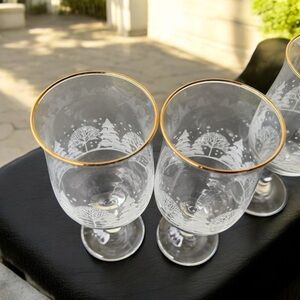 Celebrate the magic of the holiday season with this exquisite set of four vintage Libbey wine glasses. Each glass features a charming frosted winter wonderland scene, beautifully complemented by an elegant gold rim. Perfect for holiday dinners, Christmas parties, or New Year's celebrations, these glasses add a touch of nostalgia and sophistication to any gathering. Whether you're toasting with family or friends, these glasses are sure to enhance the festive spirit. Pre-owned, they carry a unique charm and history.