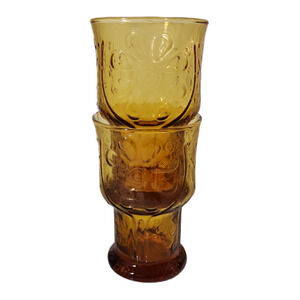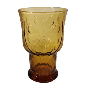 This is a set of 6 Country Garden Daisy Flower amber water glasses or tumblers from Libbey. They are 5" tall and hold 10 ounces. The glasses are stackable. They are in excellent vintage/pre-owned condition. There are no chips, cracks, or crazing. They look new.