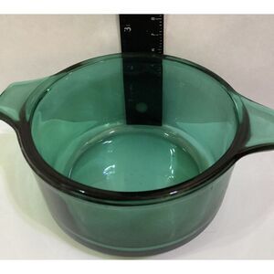 This vintage Libbey Forte Crisa Mexico bowl is a single serve dish with handles, perfect for all occasions. The teal green glass bowl has a solid pattern, round shape, and measures 4.5 inches in diameter and 2.5 inches tall. Made in Mexico, this original piece is from the brand Libbey and is recommended for hand wash only. The set includes 1 vintage green Mexico bowl with handles, making it a unique and charming addition to any collection of decorative cookware and serveware.