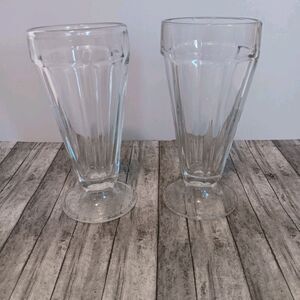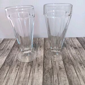 Set of 2 Libbey Glass Company vintage press glass soda fountain sundae glasses. Circa 1950-1960 7in tall, pedestal glass with basket weave 1 marked Mexico, 1 marked 7. Ribbed fluted. No cracks or chips.