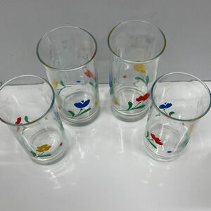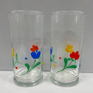 Set of four Libbey “Jubilee Tulips” drinking glasses, Mid Century Modern style. Includes two larger Cooler/Highball glasses and two slightly smaller Beverage glasses. Classic clear glass with the flared tulip shape and multicolor tulip motif. All are in good vintage condition with no chips or cracks and only light wear.