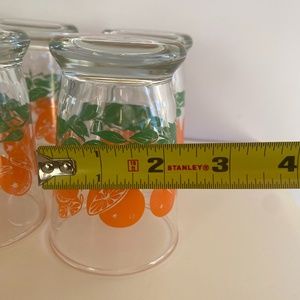 Vintage small Libbey orange juice glasses. Clear glass with vibrant oranges and greenery motif. Glasses are petite and stand 4 inches tall, rim measures 2.5 inches across. Great shape, vibrant color in graphics, no chips or cracks, although there are a few peeled oranges (no pun intended). Good vintage condition considering they are from the 1960s. Please refer to photos for dimensions and item condition.