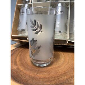 A stunning collection of frosted cooler glasses by Libbey, adorned with silver foliage designs. These vintage 1950s pieces evoke elegance and nostalgia, making them a cherished addition to any glassware collection. Their intricate designs are a testament to mid-century craftsmanship, offering both aesthetic beauty and practical use.