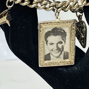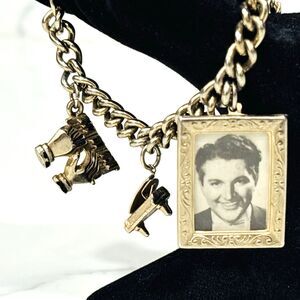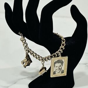 Vintage Liberace gold tone charm bracelet featuring a framed photo portrait and themed charms including a piano and candelabra. Good pre-owned vintage condition with light surface wear consistent with age. Please see photos for details and measurements.