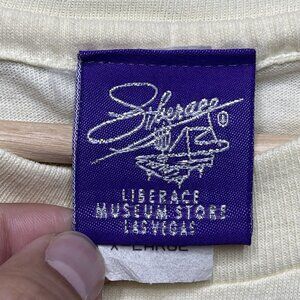 This Liberace Museum Store vintage t-shirt combines artistry and comfort. Showcasing a gold piano graphic on cream cotton fabric, it's a standout piece for collectors or fashion enthusiasts.