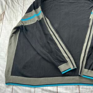 This comfortable and stylish Vintage Liberty Blues full-zip sweater is perfect for layering. It features a classic black and gray body with vibrant blue stripe accents on the sleeves, collar, and hem. The full-zip front makes it a versatile piece for casual wear.