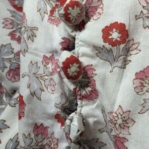Vintage possibly homemade red & ecru floral drop waist dress. Has a Liberty of London pattern. 1 pea-sized stain (yellow discoloration) on front. The covered buttons on the sleeve are a bit wonky and not symmetrical, but they work. Hook and eye loop is ripped and needs fixing. Bodice is lined. Unsure of exact size but around 6-8. Will sent measurements if interested. From the 80s/early 90s. Laura Ashley style.