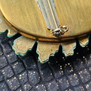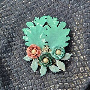 This brooch features intricate fabric flowers with pearl centers and enamel lichen /leaves. Ideal for adding a touch of vintage elegance and mycology to outfits.