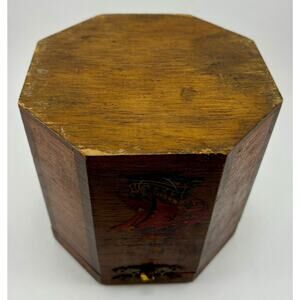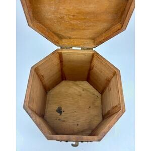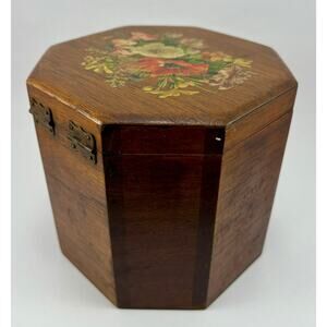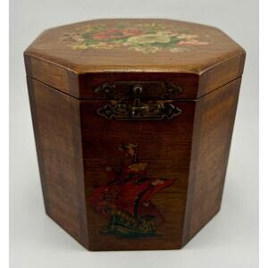 Beautiful octagon shaped wooden box with lid and brass closure on the front. Decal on the top is a gorgeous floral design, and the front features an old timey ship.