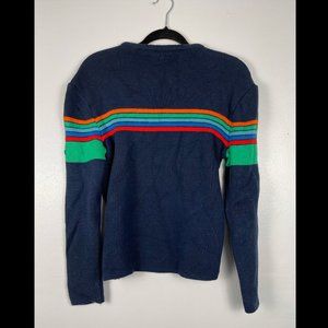Navy Blue Vintage Lido Pullover with green, red, and blue horizontal stripes.