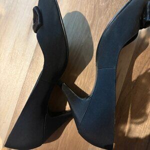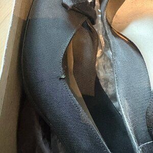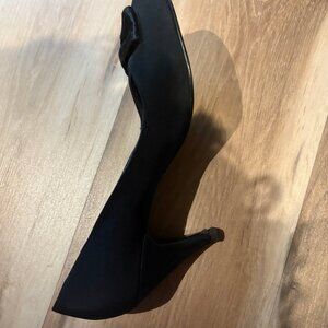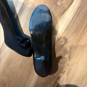 Immaculate condition evening black open-toe heels with rhinestones/bow, 3 & 1/2 inch heels, there's a