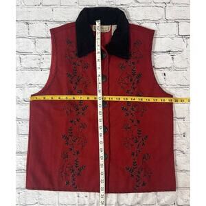 Excellent, like new condition. Stunning deep red wool blend button up vest with quarter size buttons. Embroidered with black thread and outlined with silver thread. Blanket stitch all around. Velvet collar. Lined.