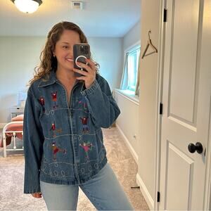 I adore this super cute true vintage LifeStyle blue denim whimsical embroidered holiday Christmas winter ice skater embroidered zip front cozy jacket