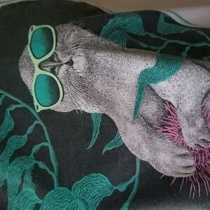 Vintage 1990s single stitch t-shirt with a graphic image of a sea otter reclining in a kelp bed with an anenome snack in its paws, wearing sunglasses. Lettering says Sea Otter and Protect Our Oceans. Made by Lifeforms International. In great condition. Size is Men's L or Women's 1X. Unisex t-shirt.