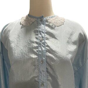 Cottagecore, romantic, vintage, light blue, lace collar, Peter Pan collar, made in USA, button-up, retro, ethereal, feminine, soft girl, prairie style, shabby chic, minimalist, delicate, long sleeve, lightweight, timeless, coastal grandma, boho, whimsical, elegant, 80s style, trending, Y2K aesthetic, Victorian-inspired.