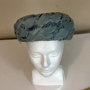 Vintage Light Blue Feather Pillbox Hat Union Label Made in USA